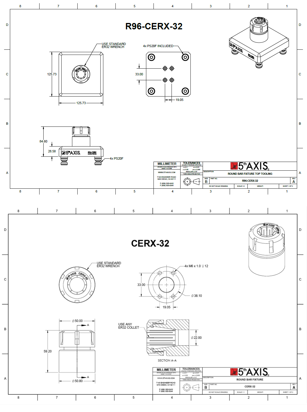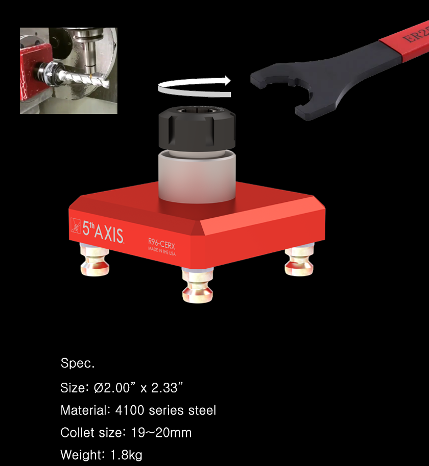 5th Axis RockLock 96mm 퀵 체인지 탑 툴링 시스템으로 가공의 미래에 투자하세요. 경쟁력을 유지하고 생산성을 높이며 가공 작업에서 탁월한 결과를 달성하세요. 품질, 정밀성, 혁신에 대한 당사의 헌신을 신뢰하고 오늘 귀사의 가공 역량을 새로운 차원으로 끌어올리세요. R96-CERX-32는 수직 밀링에서 원형 공작물을 가공하는 데 이상적인 솔루션입니다. 이 고정 장치는 모든 표준 ER32 콜렛과 호환되므로 다양한 직경의 재고를 쉽게 클램핑할 수 있습니다. 본체는 엄격한 표준에 따라 경화 합금강으로 제조됩니다.