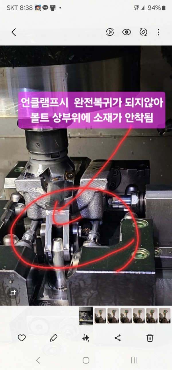 UNCLAMP시 클램프내 기존 원점으로 복귀가 한번씩 제대로 이뤄 지지 않아 소재 안착이 문제( KJF MTB-1210 제품위에 소재가 안착)가 되어 비가동이 발생이 됩니다.