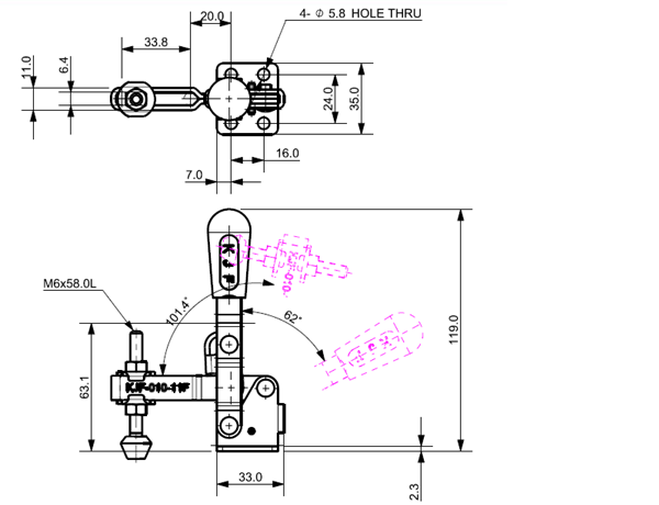 100 187 62˚ 101˚ M6 x 58.0L 34 U Short Angle Low