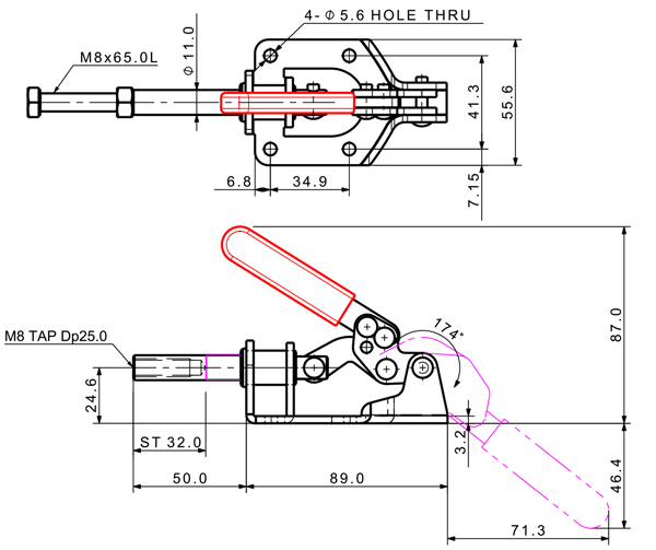 150 299 180˚ M8 x 65.0L 38 Threaded