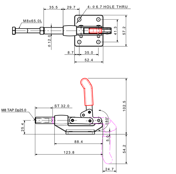 230 360 180˚ M8 x 65.0L 32 Flange