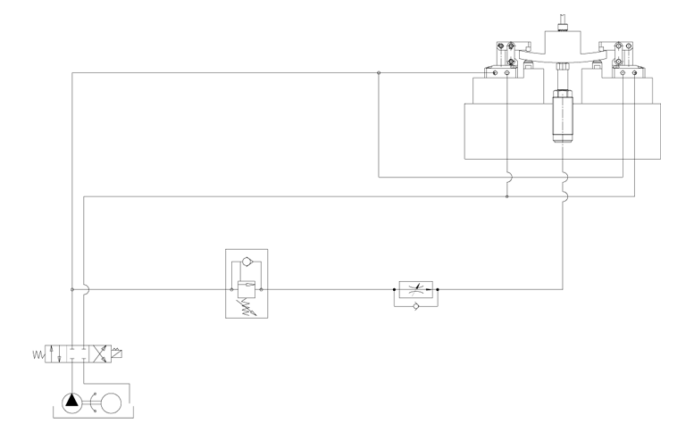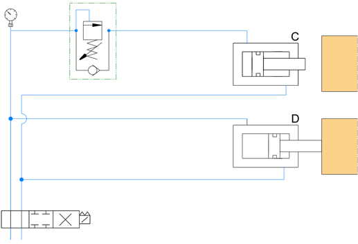 실린더 D가 빠르게 움직이는 동안 실린더 C에는 전혀 유압이 공급되지 않다가 Sequence valve의 설정압에 도달하면 유압이 공급되면서 실린더 C도 움직인다.