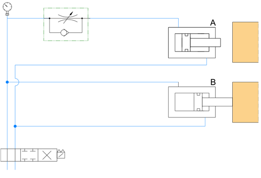즉, 회로의 압력 평형을 이루는 관계로 실린더 A가 도달 할때까지 실린더 B는 기다린다.